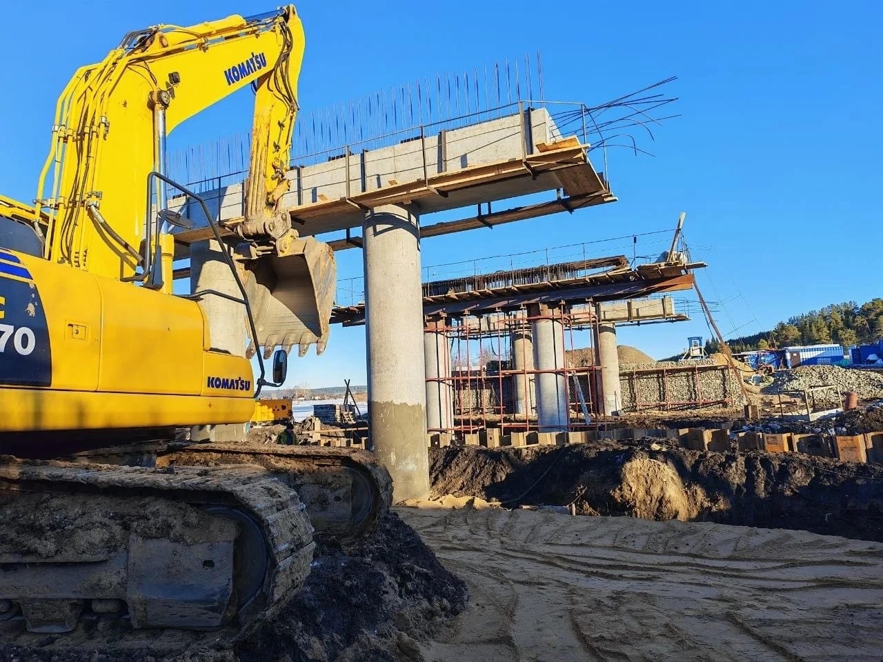 Параллельно началось возведение габионов. Также на стройплощадку завозят материалы для обустройства будущей насыпи. После начала нерестового периода рабочие приступят к работам на подходах и мостовому полотну.
